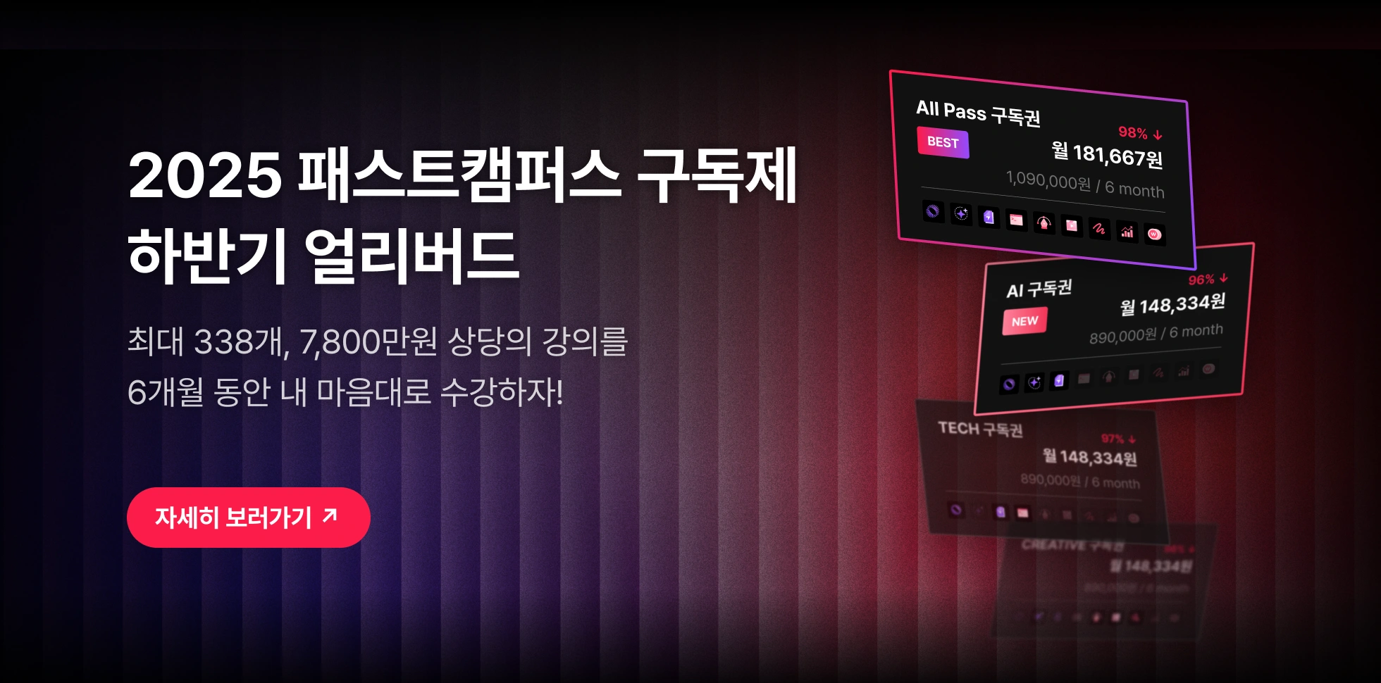 패스트캠퍼스의 모든 온라인 강의에서는 1개의 아이디로 여러명이 공유하는 형태를 금지하고 있습니다.